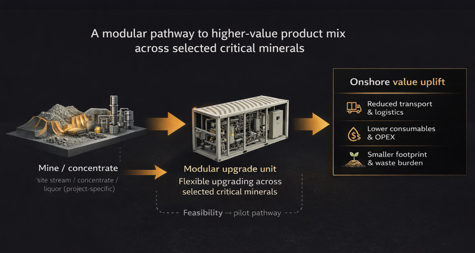 - Developers with rare earth / critical mineral process streams seeking lower-impact upgrading- Resource Groups with mineral-derived liquors/residues targeting separation pathways- Investors aligned to Australian critical mineral capability and onshore value capture