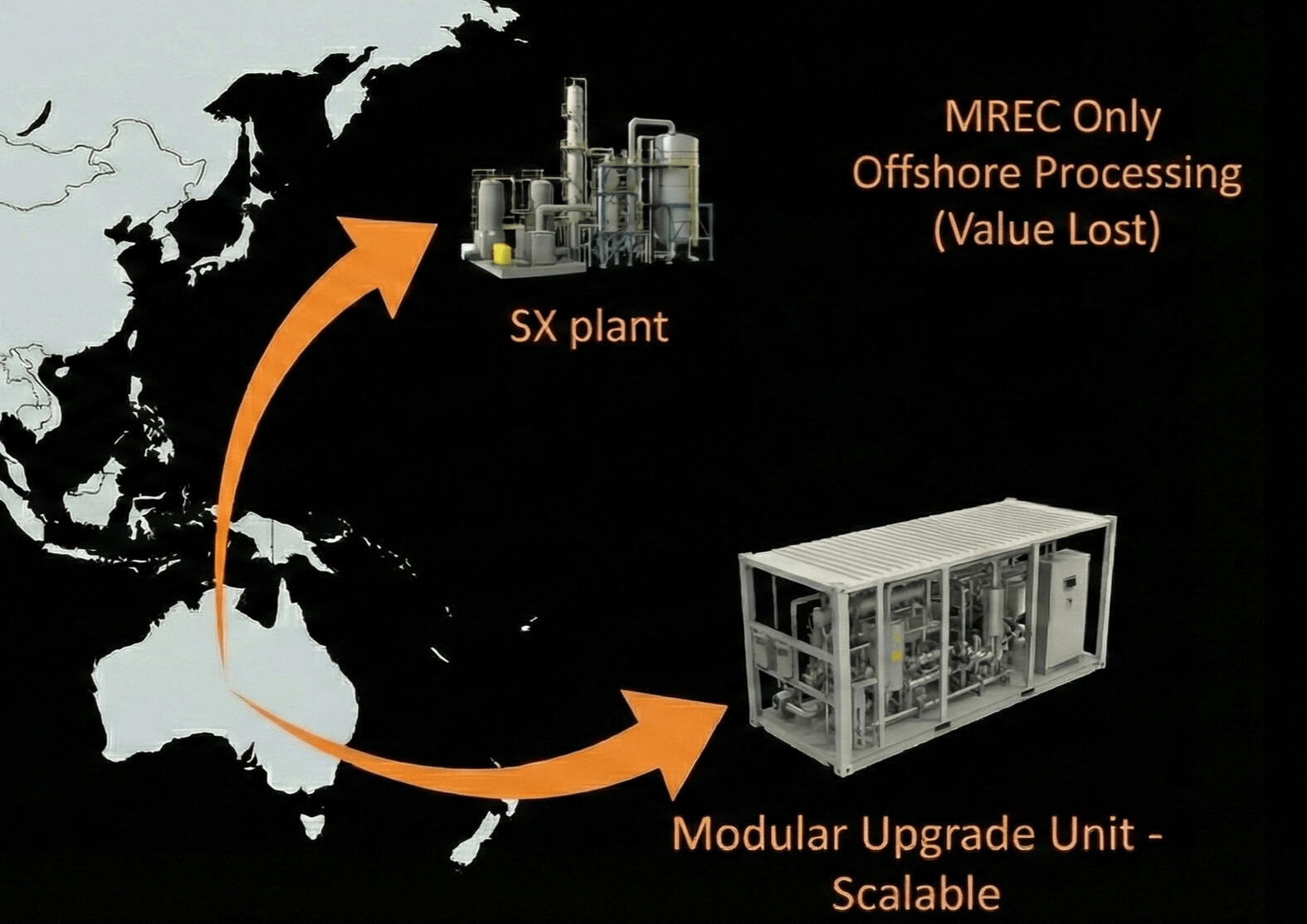 Conventional downstream processing (e.g., solvent extraction) is proven but infrastructure-heavy and often difficult to deploy in remote Australian locations.The Approach